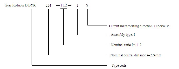3.2.1 The mark code of speed reducer include speed reducer type, nominal central distance, nominal ratio, assembly type and output shaft rotating direction.