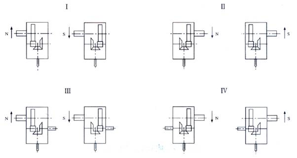 3.1.2 Speed reducer can be divided into ⅠⅡ、Ⅲ、Ⅳ four assembly types according to output shaft type, and also can be divided into clockwise and anticlockwise two types according to output shaft rotating directions. (Face output shaft)